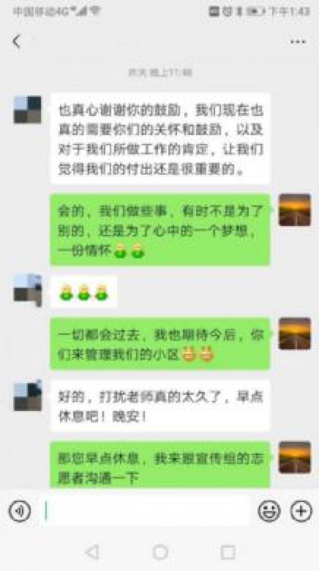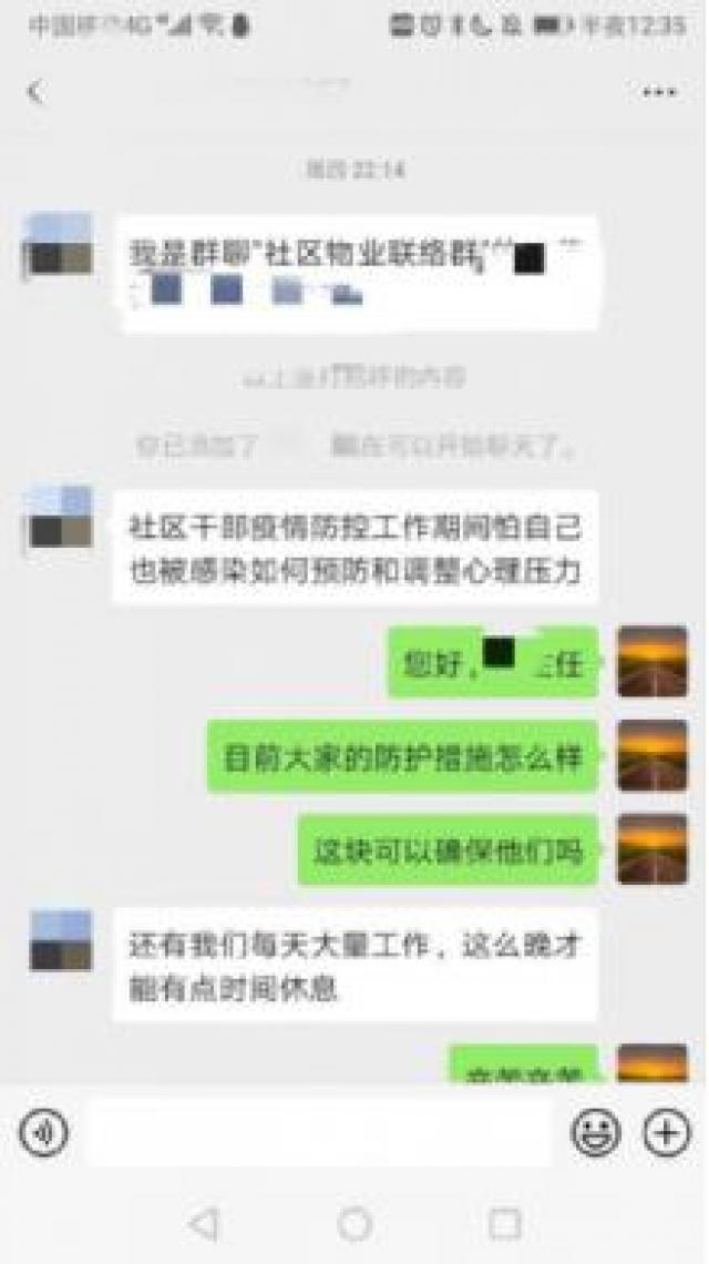 自从收到F小区某单元封闭的消息后,作为红谷滩人文关怀小组队长的王莉,根据负责该点人文关怀工作孙组长的反馈了解到,该社区7位干部已经工作在一线多日。可是当卸下工作服,他们每个人都只是有血有肉的普通人。社区干部在舍小家为大家的同时也会担心自己在一线会不会被传染,也会心生恐惧。于是,此时对于社区相关工作人员的人文关怀显得愈发重要。当晚22:59分,王莉入群后便作了发言:“大家好,我是红谷滩人文关怀小组的队长王莉,关怀我们一线的社区工作人员,也是我们的职责所在,今天太晚了,明天大家有什么困惑,咱们可以在群里分享。防控战“疫”,我们在一起!战友们,晚安!”后续,对于“口罩手套都能保证,但是我们还是害怕会被莫名的感染”,“如何预防和调整心理压力呢?”...等担心与疑惑,她耐心地倾听并不时地用共情的语言进行互动、鼓励社区干部们,使他们对疫情的担心,工作的辛苦以及连日来对家人的愧疚感等压力得到宣泄与舒缓。