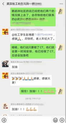 人文学院2018级社会工作硕士2班彭湘君同学,家住湖北省黄石市阳新县,于1月27日加入武汉社工志愿者服务群,1月30日又加入襄阳市心语社工援助团队,担任第三队队长一职,参与服务至今。整个团队的成员组成有线上督导和当地督导、线上社工和当地社工、社工助理、志愿者、心理咨询师、医务工作者。大家都来自天南海北,因为这场疫情,组成一个团队,每个人都紧密关心着疫情的发展,毫不吝啬地分享各种救助资源的信息,耐心解答每一位来访者的问题,帮助大家顺利把物资送往指定医院。