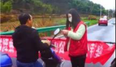 财税与公共管理学院2017级行政管理专业硕士研究生郑璐薇同学在疫情爆发后,主动请缨参与江西省上饶市玉山县双明镇徐村社区志愿服务工作。她坚守在双明镇交通干道主路口对来往车辆进行登记及卡点防守工作,并且为村民进行相关新型冠状病毒防控知识的宣传,科普疫情防护知识,并对街道聚集人员进行劝阻疏导。