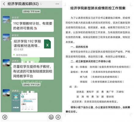 根据疫情防控形势,学院党委第一时间成立疫情防控工作领导小组,组长由党委书记邹春发和院长张利国亲自担任,党政同责。其它副职和相关科室干部各负其责,一岗双责。早在1月22日,学院就对全院83名老师,228名研究生、952名本科生的所在地信息和健康状况进行排查,排查到湖北籍师生,教师4人、本科生17人、研究生11人,与湖北武汉相关的学生57人,学院专门建立湖北籍学生微信群,并将所有湖北籍学生的信息告知班主任,要求班主任一一联系学生本人,了解他们的情况,关心他们的健康。在学院制定的《经济学院新型肺炎疫情防控工作预案》中,明确责任领导和责任人,确实落实防控任务,充分发挥辅导员、班主任、学生干部和全体师生的作用,坚持做好每天的师生健康信息统计,确保心中有数。为保障线上教学顺利开展,学院还制定了《经济学院192学期本科课程线上教学方案》,成立线上教学领导小组,明细任务;同时,认真开展第五轮学科评估等工作,做到工作不滞后。