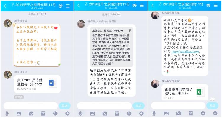 为确保学校各项工作准确快速地传达给每位同学,全体学生干部与各班班支及时上传下达,确保每位同学知晓学校禁止提前返校、线上教学、领取南昌市电子通行证等相关通知,鼓励广大青年学生加入防疫队伍,担当时代责任。