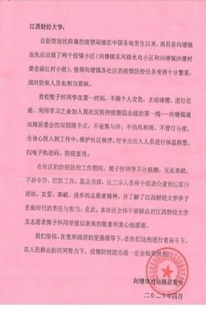 近日,我校收到三封感谢信,分别来自于江西省南昌市进贤县温圳镇、江西省共青团南昌县委和江西省南昌市向塘镇通站路居委会,这三份感谢信的主角是来自财税与公共管理学院的王锦萱同学和熊子怀同学。校党委书记王乔、校党委副书记蒋金法分别对感谢信进行了批示,对两位同学在抗击疫情中的贡献表示肯定,他们展示了江财学子的责任与担当。