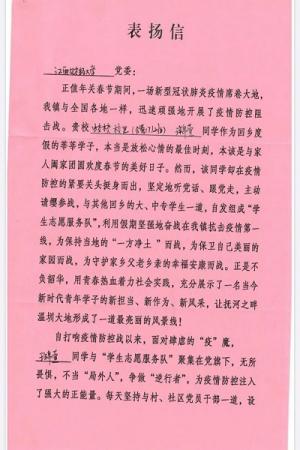 校党委书记王乔对来自江西省南昌市进贤县温圳镇的这封感谢信进行了批示,对王锦萱同学的行为表示赞赏和肯定。疫情期间,王锦萱同学挺身而出,主动请缨参战,与其他回乡的大、中专学生一道,自发组成“学生志愿服务队”,利用假期奋战在抗击疫情第一线。她每天坚持与村、社区党员干部一道,设卡值守、劝返外来人员,做实进出人员登记,在江西南昌进贤县温圳镇辖区敲锣喊话,用喇叭播放实时疫情、宣传相关防疫知识,参与心理咨询及消毒等工作,为辖区作出了积极的贡献。她的付出获得了当地镇政府、镇委的赞许与肯定。