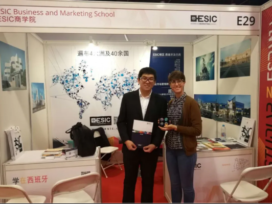 (图为许韬与西班牙ESIC商学院国际处负责人在展会上的合影)
