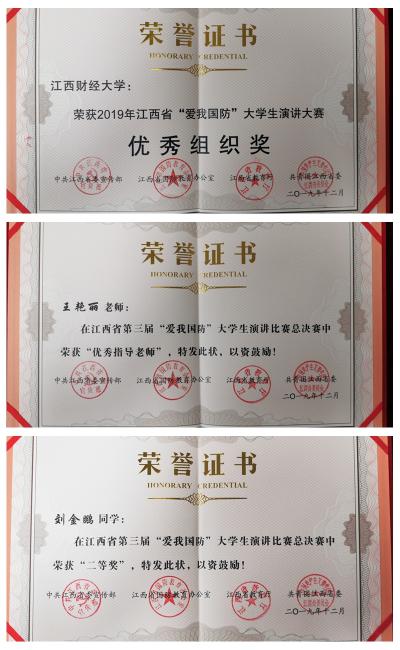 根据国家国防教育办公室关于开展庆祝中华人民共和国成立70周年群众性主题宣传教育活动的统一安排,去年6月至10月,省委宣传部、省国防教育办公室、省教育厅、团省委联合举办了江西省第三届“爱我国防”演讲比赛,我校积极组织和动员大学生踊跃参加,并在全省众多高校中脱颖而出,取得佳绩,展现了我校学子拥军尚武、健康向上的良好精神风貌。(图文/林阳 编辑/姜莹 刘洁 审核/阮艳平)