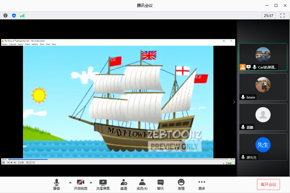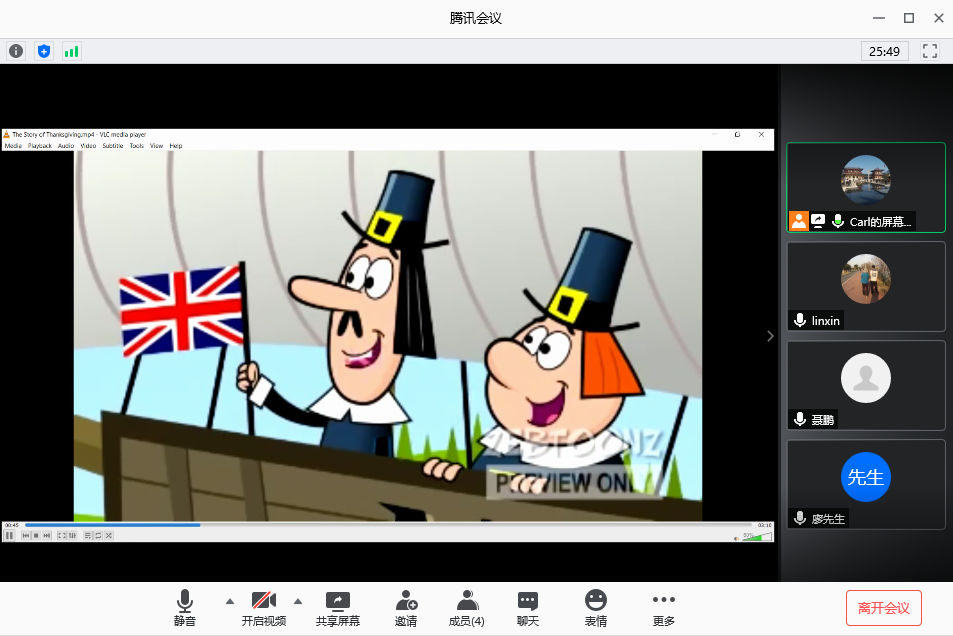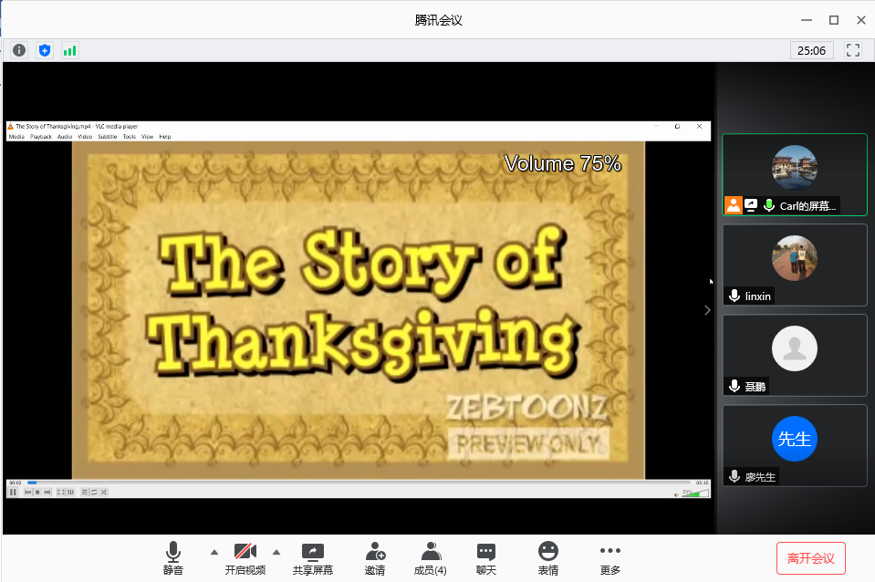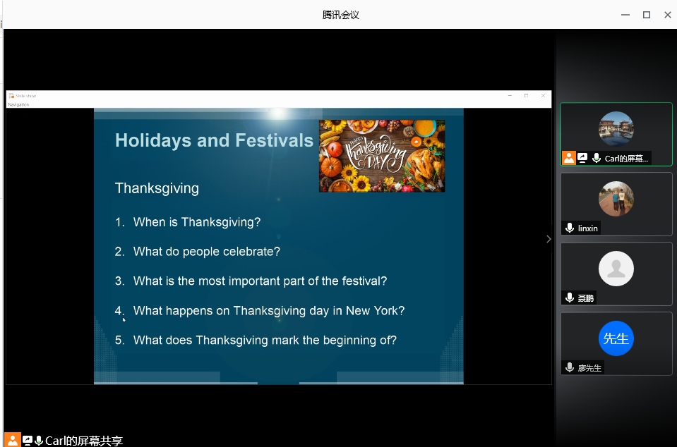 在教学方法上,Carl往往会把教材上的内容归纳成一个个问题,让同学们来回答,在互动中还不断地讲解其中的来龙去脉,同时还会及时播放一些相关的小视频,让同学们进一步了解文化的发展过程。比如”Thanksgiving”小节里,围绕着5个“W”问题,他先和同学慢慢聊感恩节是什么样的一个节日,最后又播放了一个动画小视频,进一步讲解感恩节的来历,这样,同学们就对感恩节的文化内涵了解得比较清晰。
