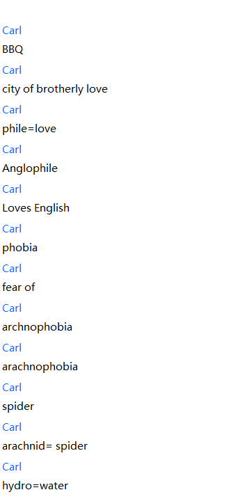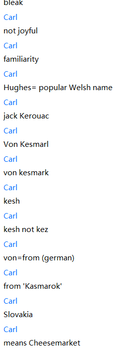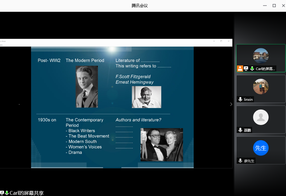 聊天窗不仅是Carl进行教学互动的通道,还是他的小黑板,在这里,他会不断地给同学带来一些有深度的文化知识,比如,他会用”bleak=notjoyful”来讲美国战前文学的背景和风格;用”Hughes =popularWelshname”来告诉同学们这个黑人作家名字的特殊性,之后又会进一步讲解一些与姓名相关的文化知识。