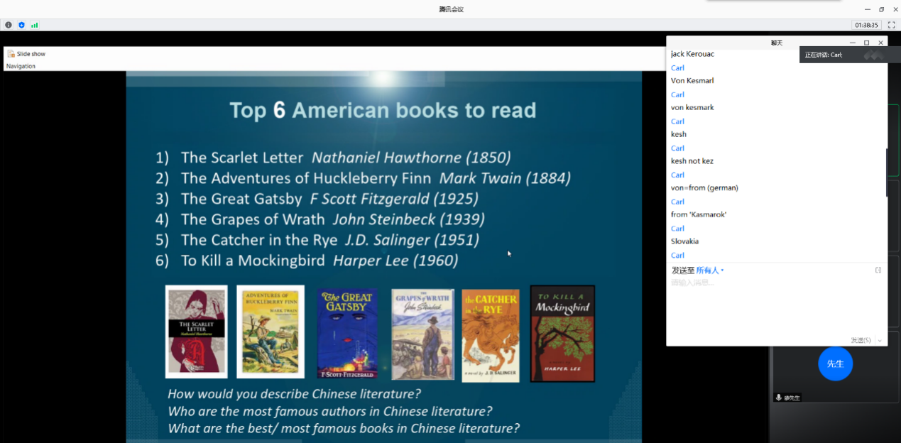 Carl还会在课程上及时带入一些新鲜的文化知识,比如在讲美国文学时,他就把当下美国人阅读排名的前6位拎出来,引导同学们去阅读自己感兴趣的作品。