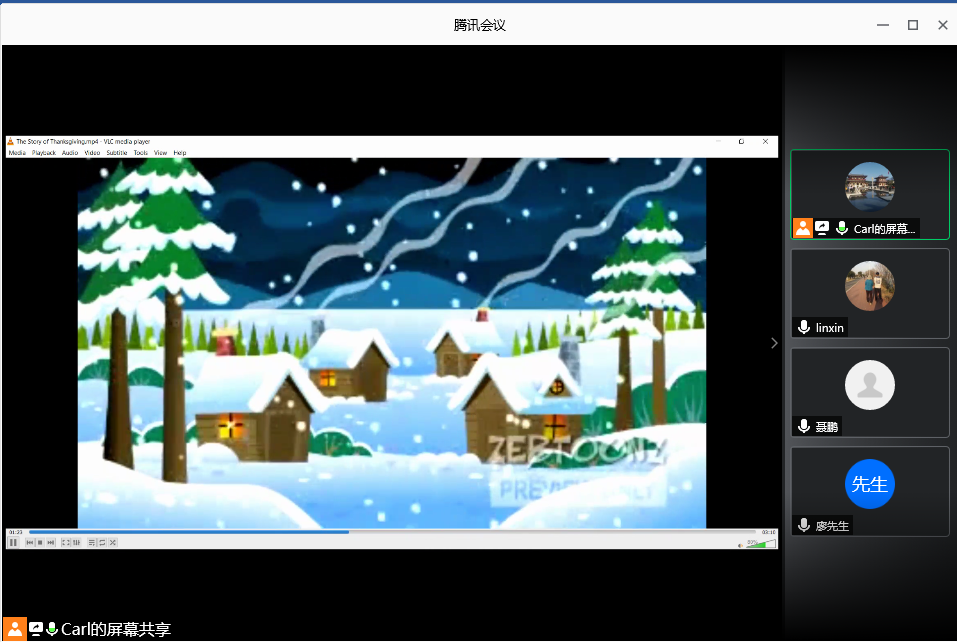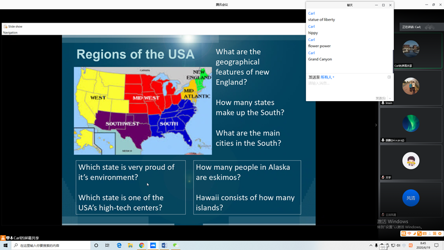 最开始上网课时,Carl是有些担心的,“你们躲起来,我找不着。”但后面他发现同学们很好找着,只要他用独特的语调叫一声:Nie,Lin,Zhao……这不,Nie帅哥就出来回答老师提问了——视频中,Carl听得特别认真,同学的回答中,如有错误,不管是语音上的,还是用词上的,他都会及时地一一纠正。所以在Carl的课堂上,同学们在学习欧美文化知识的同时,既练习了听力,又练习了语言表达。而Carl也是非常鼓励同学们口语表达的,他会时不时地讲一些单词的来历,拼法和语音的变化,由此加深同学们对某个单词的理解。