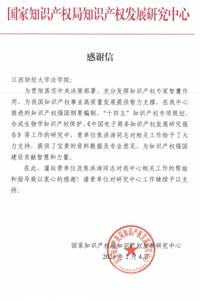 近日,国家知识产权局知识产权发展研究中心发来感谢信,感谢法学院和学院焦洪涛教授为知识产权事业高质量发展提供的智力支撑与学术贡献。