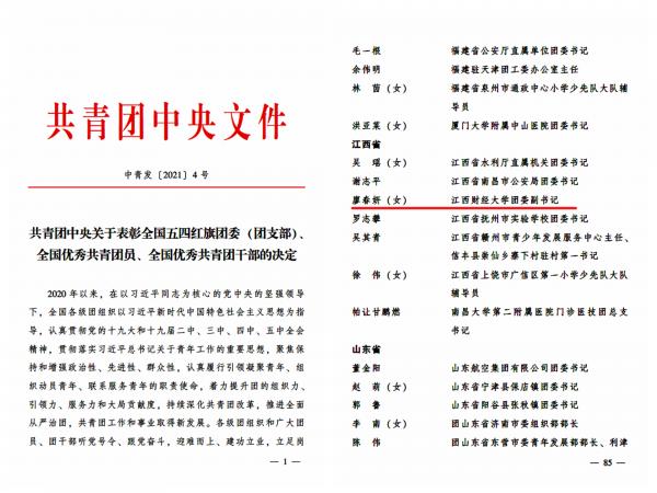 五四青年节前夕,从团中央获悉,我校团委兼职副书记廖春妍获评“2020年度全国优秀共青团干部”荣誉称号(全省高校唯一)。
