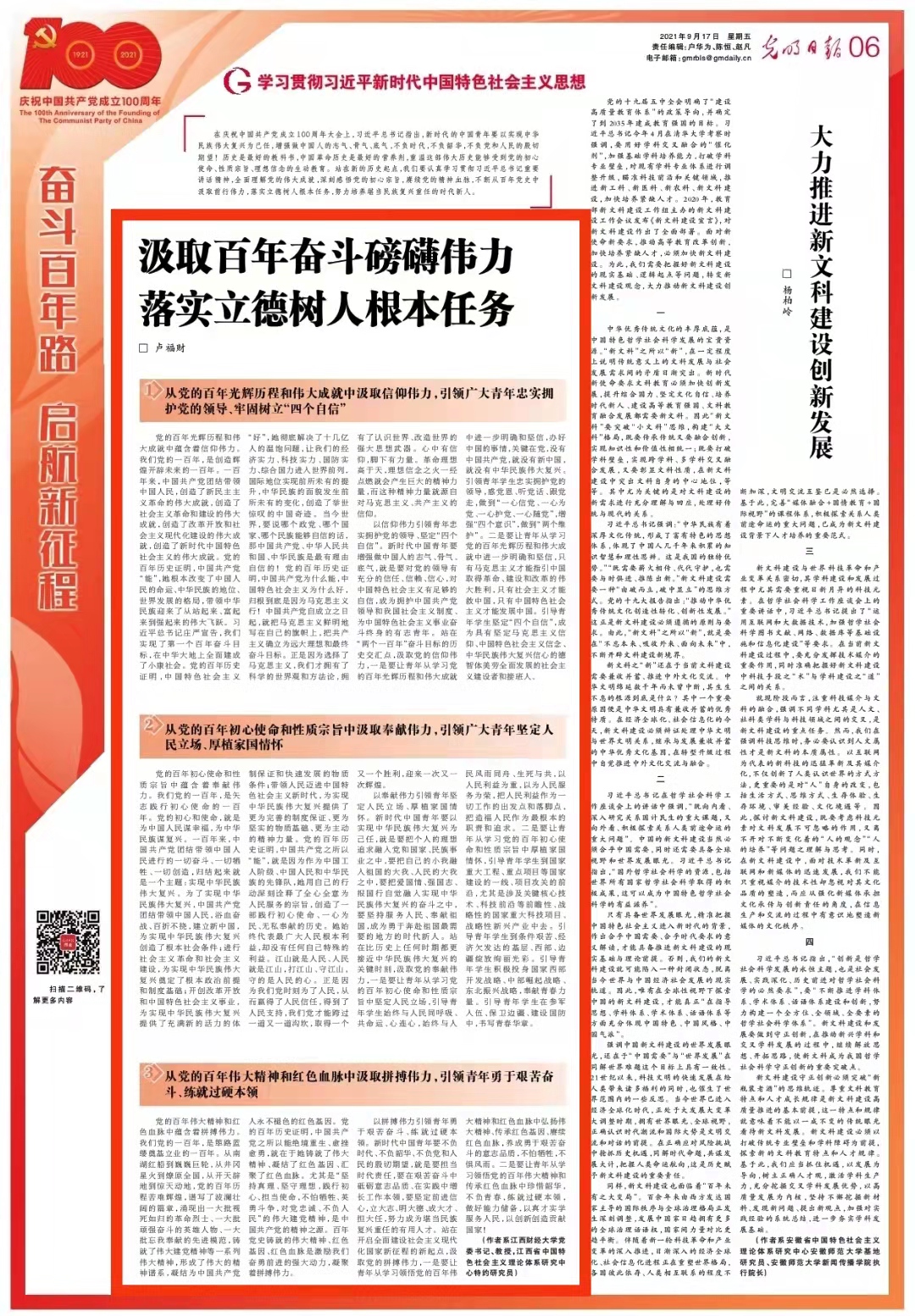 9月17日,《光明日报》06版“奋斗百年路启航新征程”栏目刊登我校党委书记卢福财理论文章《汲取百年奋斗磅礴伟力落实立德树人根本任务》。