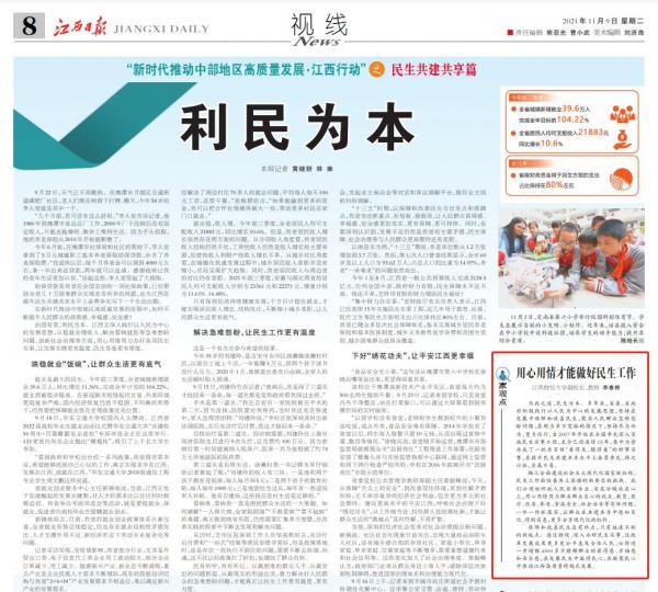 近几年,江西省级财政资金用于民生方面的支出占比保持在80%左右,今年前三季度,全省城镇新增就业39.6万人,完成全年目标的104.22%,就业质量稳步提升。11月9日,在江西日报8版“新时代推动中部地区高质量发展江西行动之民生共建共享篇”专题版块中,我校副校长、教授李春根以“用心用情才能做好民生工作”为题,对“利民为本”——全省从稳就业增收入、解决看病就医等急难愁盼问题、创新社会治理等方面,用心用情用力办好各项民生实事进行了深度解读和点评。
