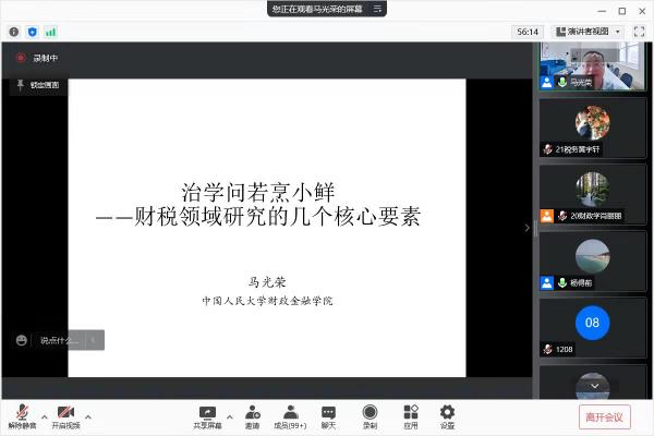 12月8日下午,中国人民大学财政金融学院博士生导师马光荣教授应财税与公共管理学院、公共政策评价中心的邀请,做客“品咖赏文”2021年第9期,为学院师生作题为“财政领域实证研究的常见误区”的学术讲座,博士生导师杨得前教授主持,学院师生及国内兄弟院校160余人参与。