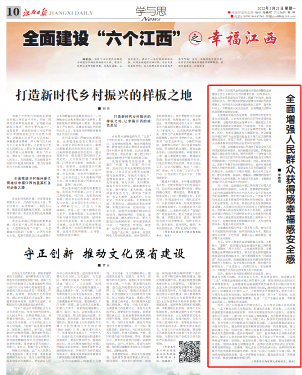 省第十五次党代会围绕全面建设幸福江西的奋斗目标,聚焦人民群众急难愁盼问题,从高处着眼、从实处着力,提出了一系列新目标新任务。2月21日,在江西日报10版“全面建设‘六个江西’之幸福江西”专题版块中,我校副校长、教授李春根以“全面增强人民群众获得感幸福感安全感”为题,对“幸福江西”——如何全面建设幸福江西,迈出民生改善新步伐,不断提高人民生活品质,全面增强人民群众的获得感幸福感安全感进行了阐释解读,提供对策建言。