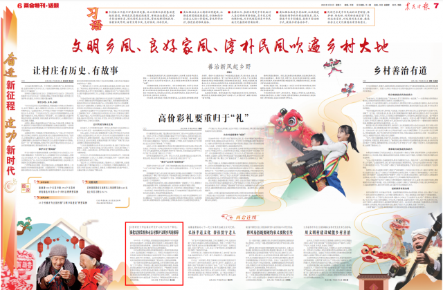 近日,在《农民日报》07版“文明乡风、良好家风、淳朴民风吹遍乡村大地”专题版块中,我校法学院监察法研究中心执行主任卢希起以《强化纪检监察和司法对维护文明乡风的保障》为题,对如何维护文明乡风和农村社会的和谐稳定提供对策建言。