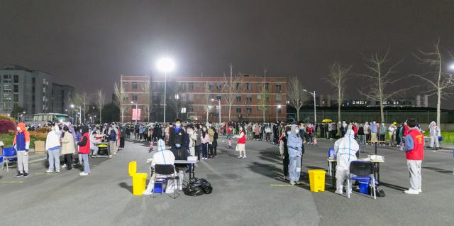 校医院统筹安排,细化调整检测方案,并于当天下午在蛟桥园北区篮球场、南区凌云广场,麦庐园北区第三教学楼门口、南区大学生活动中心,枫林园篮球场进行场地布置、运送物资,依次排开的测温等候区、信息确认区、采样区等布置有序、准备充分;安全保卫、后勤保洁等工作人员提前做好相应准备;人事处、学工部、 校团委面向全校紧急招募师生志愿者,成立抗疫突击队。师生们严格按照疫情防控要求,全程佩戴口罩,保持一米线距离,有条不紊地配合采样工作:扫码登记、发放一次性采样管、采集样本、有序离开……整个过程规范有序、安全高效。截止18日凌晨5点,完成全校师生及家属万余人的核酸检测。