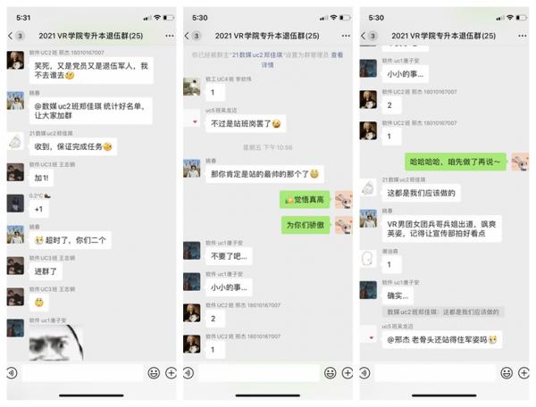 退伍士兵同学们的积极报名,无私奉献触动了学院党委副书记刘前,辅导员姚春和许欢,他们纷纷为同学们点赞,老师们说“为同学们骄傲”,数字媒体艺术UC212班郑佳琪谦虚的说“这都是我们应该做的”,“不用了,小小的事”。他们不仅视志愿服务工作为己任,还自发自主管理,以五人为一小队,每队设置队长一名,既方便老师安排工作,也方便志愿者之间的相互联系。