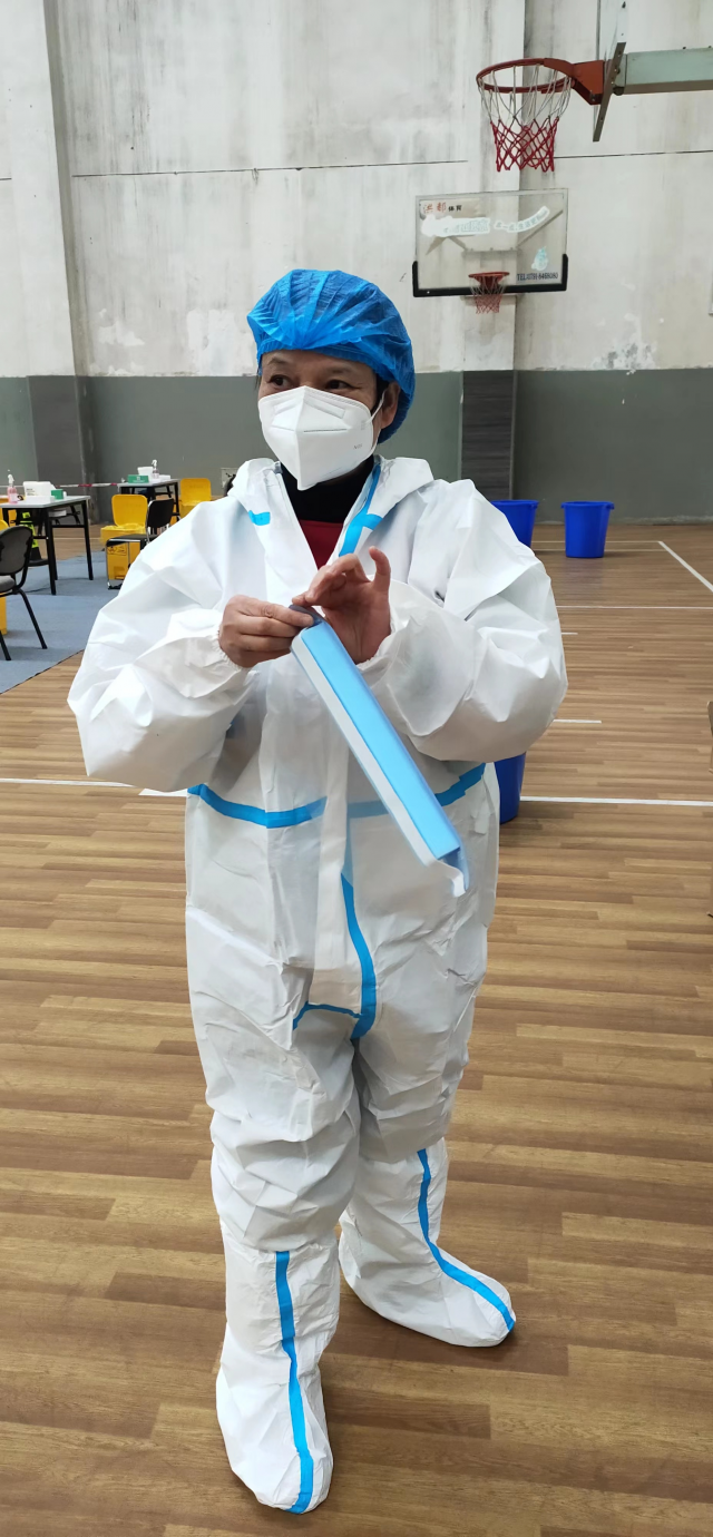 国际学院学工办主任廖春妍共有15次承担了在蛟桥园南区担任核酸检测信息录入、南区信息采集员统筹、志愿者指导工作,1次在麦庐园南区参与核酸检测信息录入、标本转运工作。每一次全员检测的现场,总有她忙碌的身影,最早来,最晚走,是她的工作标配。为了便于工作,自3月17日以来,她就住进了学校,除了中间三次回家取换洗衣物,她一直坚守在疫情防控一线。学生们为了纪念她身穿防护服在现场辛勤工作的身影,为了她制作了专属“大白”表情包,还为她拍摄了纪念视频。