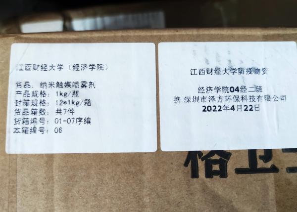 作为本次联合捐赠企业,深圳市泽方环保科技有限公司是我校2004级经济学2班多位校友于2015年联合创立。该企业创立8年来,一直专注于室内空气净化治理、生活环境优化、绿色建筑新材料、功能性健康净化材料等新材料领域。本次捐赠的产品——纳米触媒喷雾剂,是深圳市泽方环保科技有限公司自主开发的一种工艺先进的纳米贵金属氧化物新材料,对环境中各类细菌病毒因子如:肺炎链球菌、金黄色普通球菌、大肠杆菌,流感病毒等具备快速高效杀灭作用,本产品的捐赠为我校病毒消杀和疫情防控提供了有力支持。(文/曾为华 编辑/徐嘉威 审核/姜莹 赵旻 李大晖)