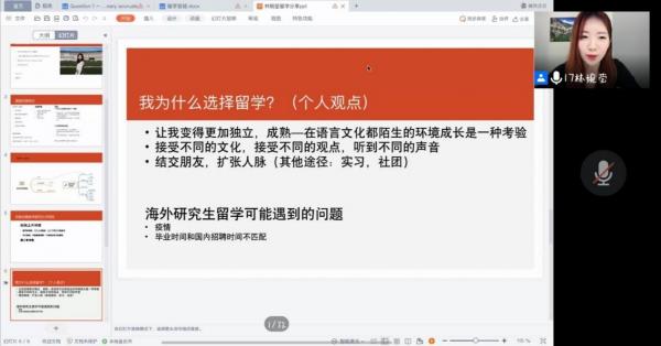 活动伊始,林婉莹同学进行了自我介绍,并分享自己的留学经历及看法。她认为,前往国外留学不仅能够提前适应海外的教学氛围和生活环境,还能学到商科知识、利于申请研究生,同时,更能接触到不同的文化和观点,是对自己成长的一种考验。
