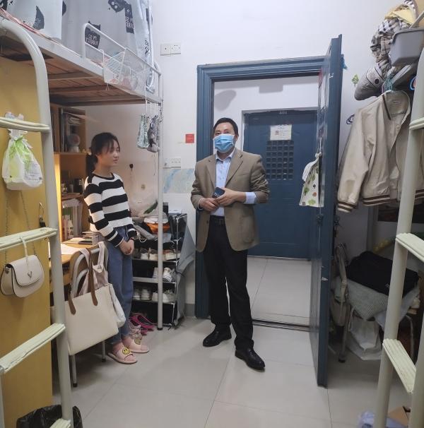 桂荷发在走访学生宿舍时,就线上学习、宿舍内务卫生等方面和同学们展开深入交流。并反复叮嘱同学们,要做好防护措施,要静心学习,努力赢取新成就。