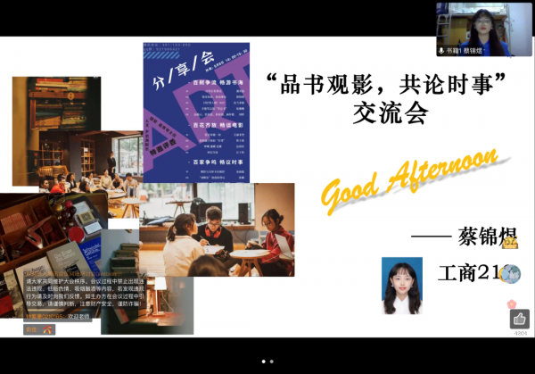 在书籍介绍部分,蔡锦煜、沈弋菲然、易珊珊、刘婷四位同学依次做读书分享。在疫情形势下,沈弋菲然从《蛤蟆先生去看心理医生》出发,结合心理学知识与实际情况,讨论了控制焦虑的具体方法。刘婷立足中国传统优秀文化,将《白鹿洞书院揭示》与我校“信敏廉毅”的校训相联系,创造性发扬了中华传统美德。