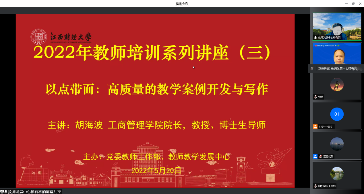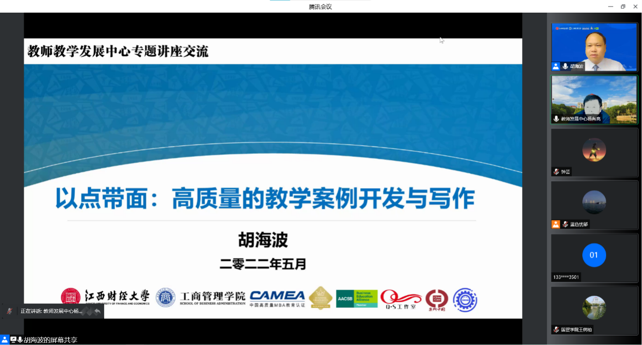 5月20日下午,教师教学发展中心举办的2022年教师培训系列讲座第三讲“以点带面:高质量的教学案例开发与写作”开讲。本次讲座以腾讯会议的方式进行,讲座由工商管理学院院长、教授、博士生导师胡海波担任主讲,教师教学发展中心副主任杨有亮担任主持,共296名师生在线学习。