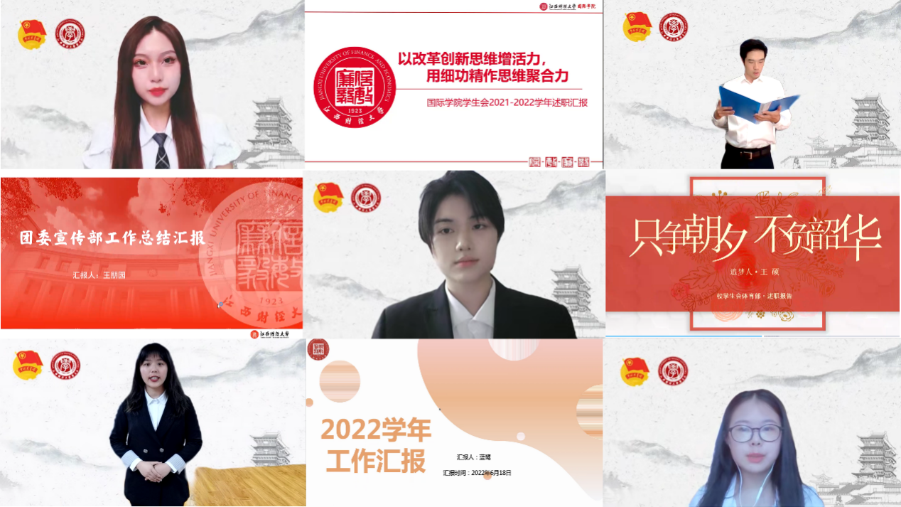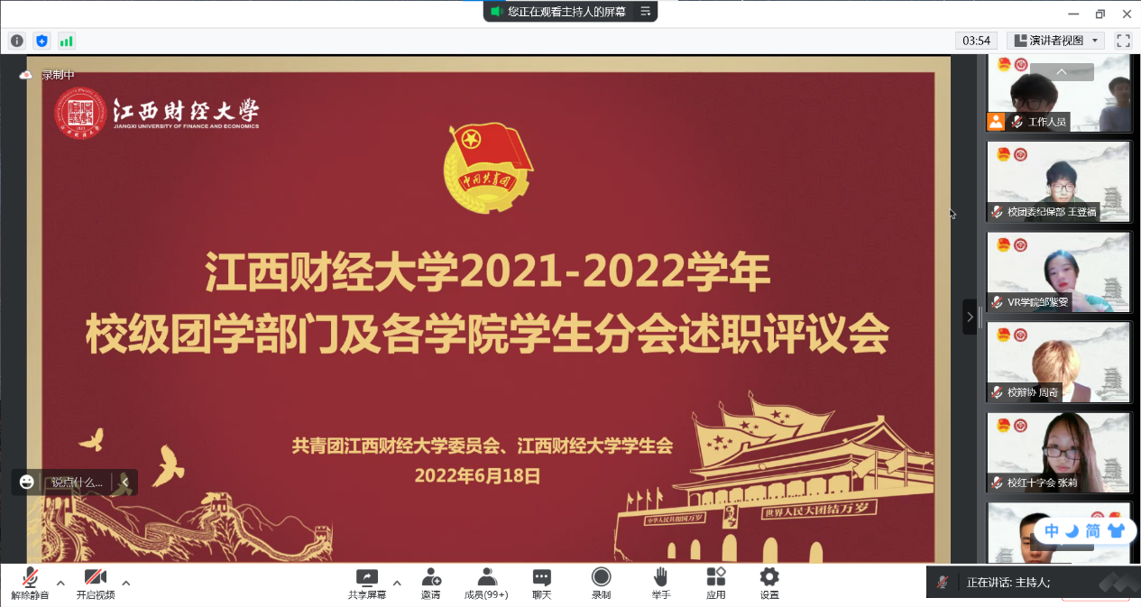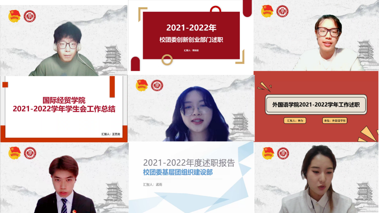 6月18日下午,我校2021-2022学年校级团学部门及各学院学生分会述职评议会在线召开。校团委副书记阳铃,校团委兼职副书记廖春妍、胡坤、廖波、陈曦及各学院团委书记,校学生会主席团成员、校团委部门、校学生会部门、校团委直属社团及各学院学生分会负责人、述职代表,以及部分团员青年代表参加会议。