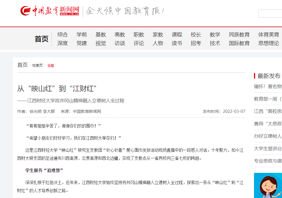 中国教育新闻网以“从‘映山红’到‘江财红’——江西财经大学将井冈山精神融入立德树人全过程”为题,通过“学生服务‘追理想’”“红色教育‘闯新路’”“铸魂育人‘求胜利’”三个方面,全面讲述了学校始终坚持将井冈山精神融入立德树人全过程,坚持利用好红色资源、发扬好红色传统、传承好红色基因,探索出一条弘扬跨越时空的井冈山精神铸魂育人之路。