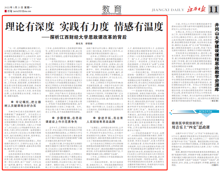 《江西日报》11版以“理论有深度实践有力度情感有温度——探析江西财经大学思政课改革的背后”为题,从“牢记嘱托,把立德树人关键课程办好办实”“步履铿锵,在思政课建设上作示范勇争先”“奋进开拓,亮出育人实招培育思政品牌”三个方面阐述了学校从领导体制、工作机制等方面全面支持思想政治教育创新,形成高质量人才培养体系,在思政课建设上作示范、勇争先,亮出育人实招、培育思政品牌。