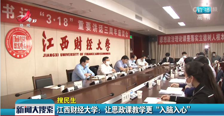 江西卫视《新闻大搜索》“江西财经大学:让思政课教学更‘入脑入心’”的新闻和江西教育电视台《教育新闻》“江西高校重温习近平总书记“3.18”重要讲话精神”新闻中,报道了学校召开座谈会,对提升思政课教师的思想政治素质和教学业务水平进行交流和研讨。报道指出,座谈会现场,师生们结合自身工作和学习经历,在如何加强和改进思政课建设,创新思政课教学方式等方面进行交流。(图文/王艳丽 审核/姜莹 赵旻 李大晖)