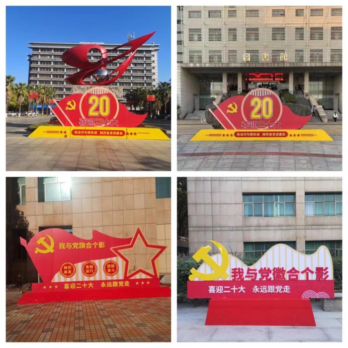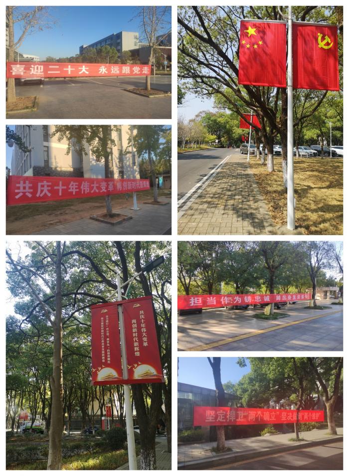 从立体标识的设计到宣传标语的选择,从绿植摆放的位置到横幅张贴的长度,“喜迎二十大”环境布置工作精心规划,历时近两个月。随着盛会临近,江财校园越来越红,越来越美。走进校门,映入眼帘的是“喜迎二十大”及“我与党旗合个影”“我与党徽合个影”的立体标识;校园主干道上一排排鲜艳的五星红旗和党旗随风轻展;灯柱上“喜迎二十大 永远跟党走”的道旗分外醒目;地下通道的橱窗里,一幅幅红绸金光为背景的标语喷绘整齐排列;“担当作为铸忠诚,踔厉奋发迎盛会”“牢记嘱托作示范,感恩奋进勇争先”“奋进新征程、建功新时代,以优异成绩迎接党的二十大胜利召开”一条条横幅标语振奋人心……