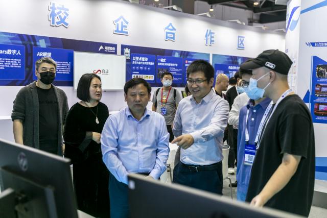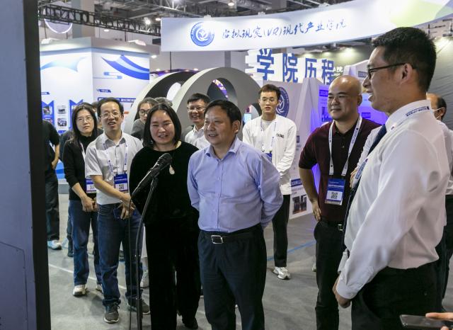 11月11日下午,在2022年世界VR产业暨元宇宙博览会即将拉开帷幕之际,校党委书记卢福财参观指导学校展位。