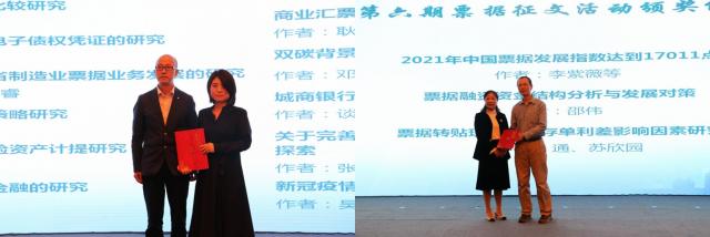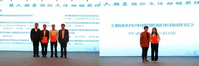 会上,还公布了江西财经大学九银票据研究院、《上海立信会计金融学院学报》编辑部、《当代财经》杂志社第六期票据征文活动评选结果,并举办了征文颁奖仪式。江西财经大学九银票据研究院秦书卷秘书长宣读了获奖名单,工商银行原研究总监、江财九银票据研究院顾问詹向阳,上海票据交易所监事长周荣芳,江西财经大学副校长袁红林,九江银行股份有限公司行长肖璟,上海立信会计金融学院学报学术期刊中心副主任李湖生分别为特等奖、一等奖、二等奖及三等奖获奖者颁发证书。