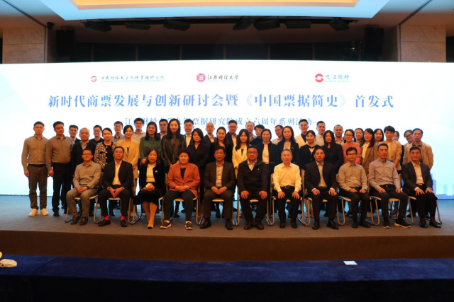 11月11日,由江西财经大学九银票据研究院中国商票研究中心主办,江西财经大学、九江银行股份有限公司承办的“新时代商票发展与创新研讨会暨《中国票据简史》首发式”在中国金融信息中心举办。出席此次会议的嘉宾有江西财经大学副校长袁红林,九江银行股份有限公司行长肖璟,上海票据交易所监事长周荣芳,工商银行原研究总监、江西财经大学九银票据研究院顾问詹向阳,上海证券报、中国金融信息中心党委书记、董事长、上海石油天然气交易中心董事长叶国标,江西财经大学九银票据研究院执行院长肖小和,人民银行上海总部金融市场部处长杨明奇,同济大学马克思主义学院教授万立明,上海票据交易所研究规划部总经理颜永嘉,中国工商银行票据营业部专家张涤尘,江财九银票据研究院高级研究员赵慈拉,原交通银行发展研究部资深专家周昆平、农业银行审计局上海分局局长董玉华以及来自高校的专家学者,来自商业银行、证券公司、经纪公司等票据从业人员,和来自报刊、杂志社的媒体朋友们。