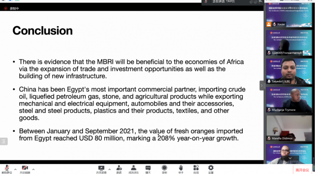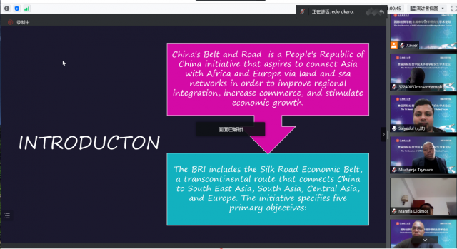 来自尼日利亚的国际贸易专业博士留学生TEMITAYO ADEGBOYEGA,从多个角度向大家介绍了“一带一路”背景下新“苏伊士运河项目”,其实施为该地区增加贸易和投资流动、促进经济一体化、减少贫困和创造新的就业机会提供了重要平台。尼日利亚籍博士留学生EDOOKARO与大家分享道:自2013年“一带一路”被正式提出以来,大多数非洲国家积极参与,并对其经济增长和社会发展产生了积极而深远的影响。在“一带一路”背景下,非洲各国之间的联系更为紧密,这些国家能通过其框架下的各类经贸合作项目实现目标并且从中受益。