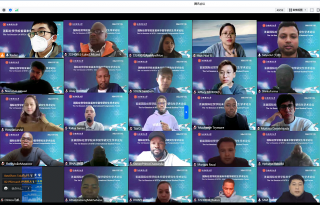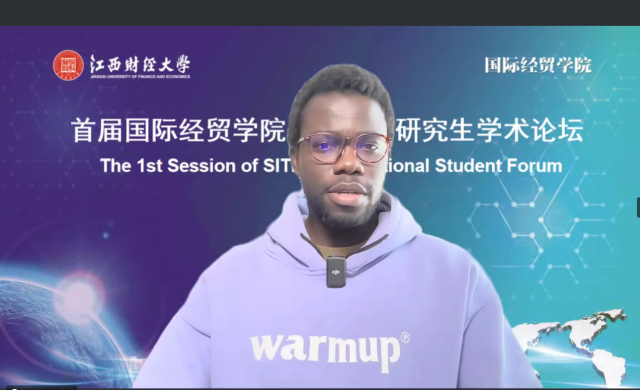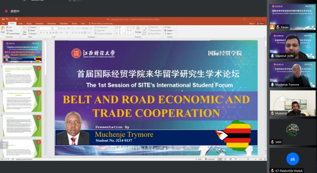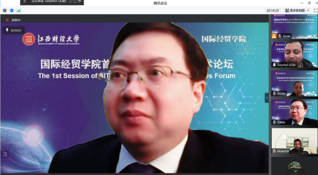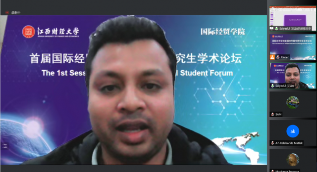 12月24日下午,国际经贸学院首届来华留学研究生学术论坛成功举办。本次论坛通过腾讯会议进行,邀请了来自孟加拉国、尼日利亚、加纳、津巴布韦、印度尼西亚等6个国家的优秀硕士、博士来华留学生做主旨演讲,主题围绕“一带一路”倡议下区域经贸合作展开。国际经贸学院院长吴朝阳出席开幕式并致辞,副院长汤晓军、留学生辅导员许韬及境内外90余名来华留学生线上参与论坛。本次活动由2020级国际贸易专业博士留学生Mohammad SaiyedulIslam主持。
