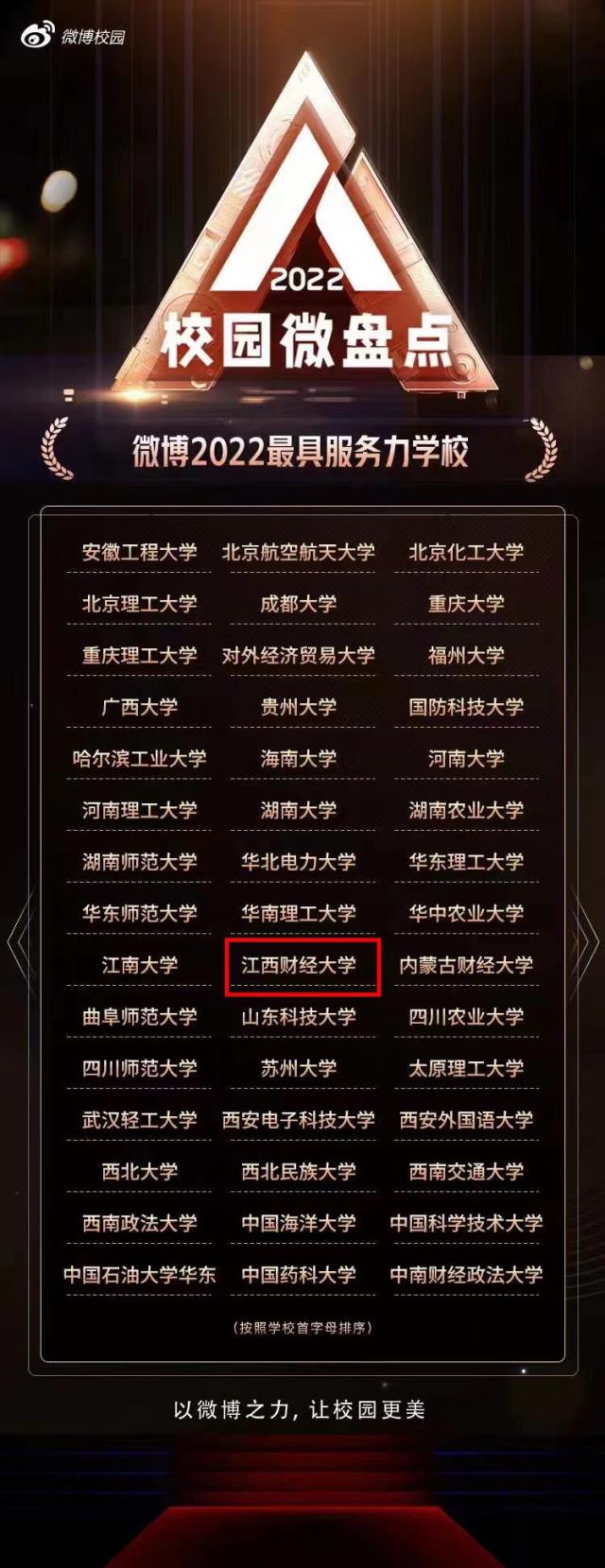 我校官方微博@江西财经大学由党委宣传部、文明校园建设办公室下设学生组织新媒体运营中心负责运营管理。开通以来,紧紧围绕校园融媒体价值引领和立德树人功能,传播江财声音,讲好江财故事,目前拥有粉丝20.6万人,发布微博2.3万条。官博团队积极参与微博校园、共青团中央等联合发起的助农、植绿护绿等多项主题公益全国高校联动活动,与校园领域头部账号进行矩阵联动,打造出“江西财经大学99周年校庆”等微博爆款话题,登上热搜全国榜第五位,阅读量高达4312万,108所高校参与联动,为传播学校影响力,贡献微博力量。