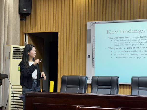 王青分别从研究动机、研究假设、实证分析、主要结论等方面对论文展开阐述。她在论文中提出了四点假设:其一,社会信用改革与企业获得商业信用呈正相关;其二,社会信用改革对商业信用的积极影响在没有政治关系的私营企业和小企业中更为明显;其三,在市场化程度较低、法制环境较差的地区,社会信用改革对商业信用的积极影响更为明显;其四,社会信用改革对商业信用的积极影响在企业位于不同城市或远离供应商时更为明显。