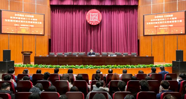 卢福财以“志存高远 行且坚毅 科学把握党的二十大精神 为实现中国式现代化贡献青春力量”为题,立足深入学习贯彻党的二十大精神,围绕“踏平坎坷成大道”“斗罢艰险又出发”“青春奋斗正当时”三个方面,结合在校大学生实际情况,讲授了“开学第一课”。从三年抗疫、国际形势变化、我国高质量发展成绩等方面,用“充满挑战的五年”“催人奋进的五年”“值得纪念的五年”回顾了党和国家在过去五年极不平凡的经历和取得的伟大成就;从“六个坚持”“五项重大原则”“三个务必”等方面,从“牢牢把握党的二十大提出的治国理政新理念新思路新战略”“牢牢把握中国式现代化的理论建构和根本遵循”“牢牢把握教育科技人才的基础性战略性支撑作用”,深入讲解了党的二十大精神和中国式现代化的内涵要义;从“立大志”“担大任”“明大德”“成大才”等方面,激励大家要坚定信仰信念信心,主动服务国家战略,拒绝“躺平”,正视“内卷”,远离“享乐”,争做有理想、敢担当、能吃苦、肯奋斗的新时代好青年,为实现中国式现代化贡献青春力量。