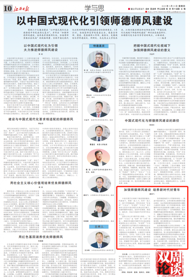 323日,《江西日报》10版“学与思”之“以中国式现代化引领师德师风建设”报道校党委副书记龚剑飞参加“中国式现代化视域下师德师风建设”研讨会并进行交流发言。