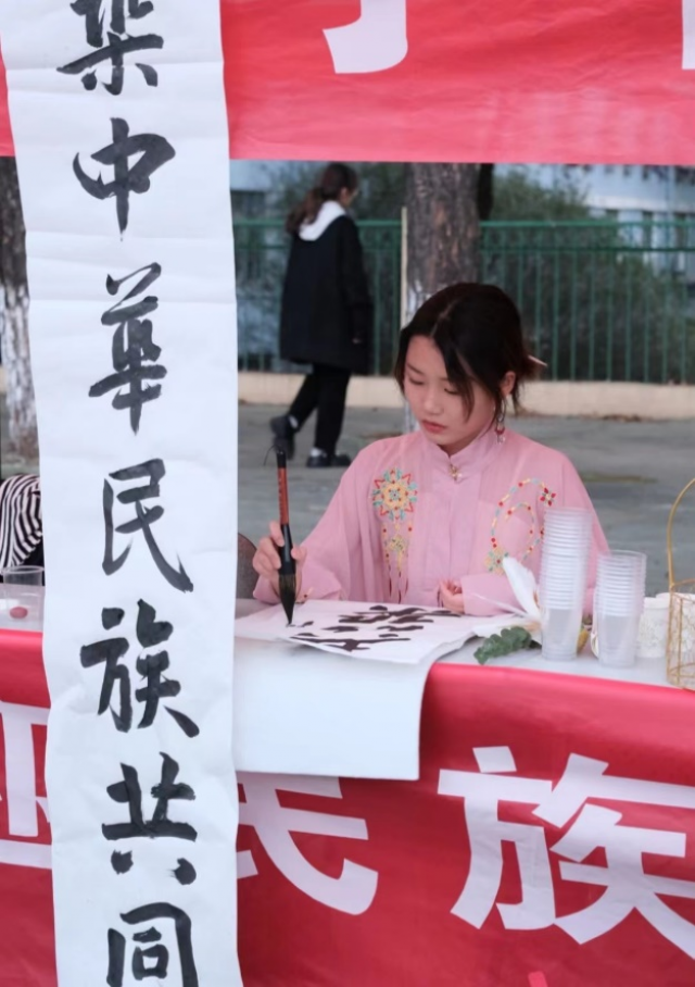 伴随着青春的律动,民族文化艺术节在传统文化——书法表演中拉开序幕,江财学子用自己手中的毛笔,书写出“铸牢中华民族共同体意识”,诠释着民族情、爱国心,道出我们各民族师生共同的心声。