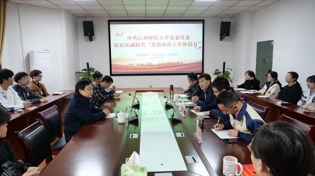 4月6日上午,党委常委、副校长陈始发到虚拟现实(VR)现代产业学院开展“思想政治工作体验日”活动,了解学院学生党支部的建设情况,与学院师生党员亲切交流,共话成长。院长廖国琼,党委书记彭敏、副书记刘前,副院长万征等参加活动。