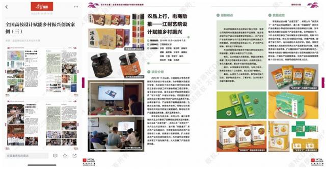 其间,在学院组织下,200余名师生参加了设计赋能乡村振兴活动,绘制700余份设计草案,推出近百款设计方案,并量产销售。同时,为吉水县、井冈山市、遂川县等地农品上行提供农产品品牌策划,如吉水县“吉香万里”、井冈山市“井贡天下”农产品公共品牌,遂川县“田园遂月”系列农产品包装提升;与靖安县共同承办农产品创新设计大赛,征集全国设计创意,扩大靖安县农产品知晓度和影响力;为丰城市冻米糖企业实现产品包装升级,大大改善了产品的品牌形象。经过3年多的努力,有效提升农产品附加值,打通农产品销售渠道,帮助相关产品实现直接销售额1000余万元,间接带动经济价值上亿元。省工信厅、地方政府和企业给予高度评价。