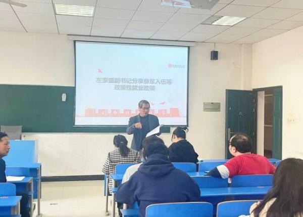 左家盛分享了学校和国家参军入伍等就业政策。他详细阐述了入伍的各项要求,包括年龄要求及国家和学校对入伍学生的相关帮扶政策。左家盛表示,现代国防建设需要高质量人才,鼓励青年学子将爱国心践成爱国行动,他真诚呼吁大家积极参军入伍,丰富人生经历。“吾辈少年当自强,踊跃参军慨而慷。”希望毕业生携手共赴强军梦,奋勇争先筑国防。