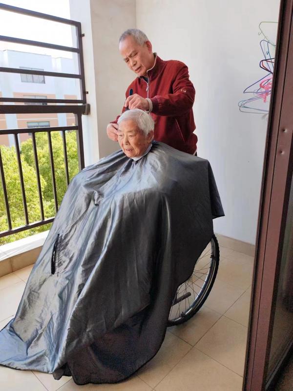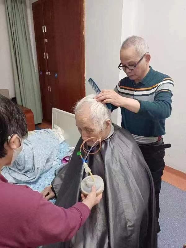 4月30日下午,谢教授又驱车到青山湖区养老院,看望曾住在财大青山路宿舍区因脑梗而失去吞咽功能和语言功能的吴女士,并为她和其他病友理发。