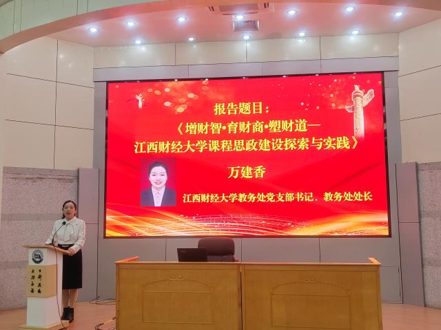 会上四个党支部结合自身工作实际,围绕党建引领业务的经验做法进行深入交流分享。我校教务处党支部书记、教务处处长万建香以“增财智•育财商•塑财道——江西财经大学课程思政建设探索与实践”为题作专题报告。报告从课程思政的建设理念、建设举措、建设保障、建设成效四个方面详细介绍了江西财经大学课程思政的探索与实践。报告中分享的宝贵经验对适应新时代要求,持续加强课程思政建设具有重要的借鉴意义和学习价值。
