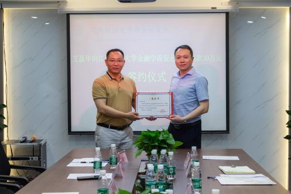 之后,王琪代表金融学院与艾磊华签署捐赠协议,钱建豪向艾磊华颁发《捐赠证书》。他代表全院师生对艾磊华校友此次捐赠表示深深地感谢,并简要介绍了科技金融研究中心在学科发展、人才培养、科学研究等方面取得的成绩,表示将更好地推进金融学术研究发展。