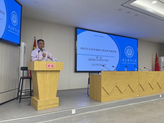 近日,南京审计大学会计学院副院长、会计与治理研究院副院长潘俊教授在会计学院以“政府会计改革进展与理论研究新机遇”为题为学院师生带来了一场精彩讲座。讲座由学院廖义刚教授主持,学院部分教师及研究生到场聆听讲学。